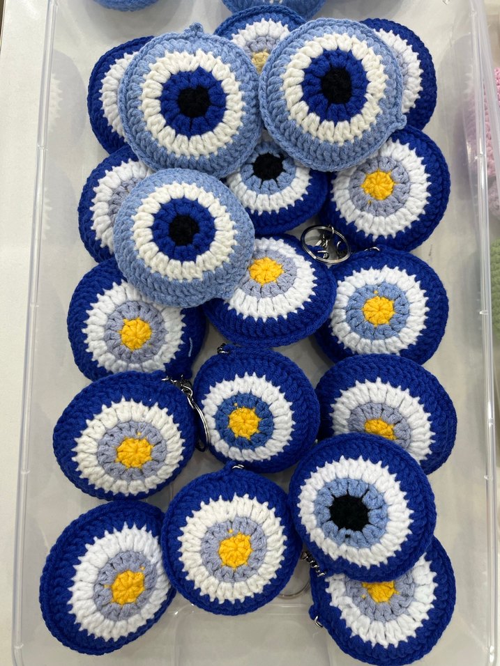 Renkli örgü anahtarlıklar, rahat bohem tarzda göz motifleri içerir. Anahtarlarınıza retro ve hippie bir dokunuş katar. Adet fiyatı