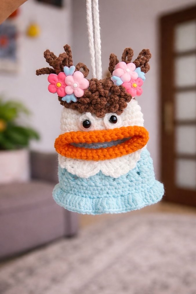 Mavi elbise, turuncu dudaklı ve kahverengi saçları çiçek süslemeli renkli örgü oyuncak bebek anahtarlık. Büyük gözlü ve takmak için metal anahtarlık.