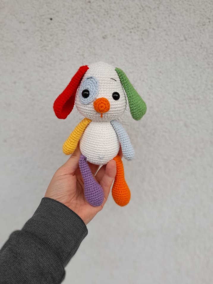 Yumuşak örgü dokusuyla renkli kulaklar ve bacaklara sahip el yapımı oyuncak köpek. hazır ürün
