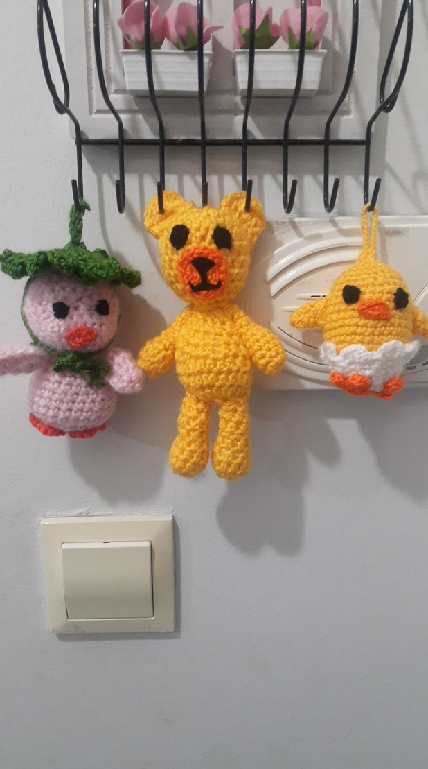 Sarı ayı, yeşil şapkalı pembe figür ve beyaz turuncu detaylı sarı civcivden oluşan renkli örgü oyuncak seti.
