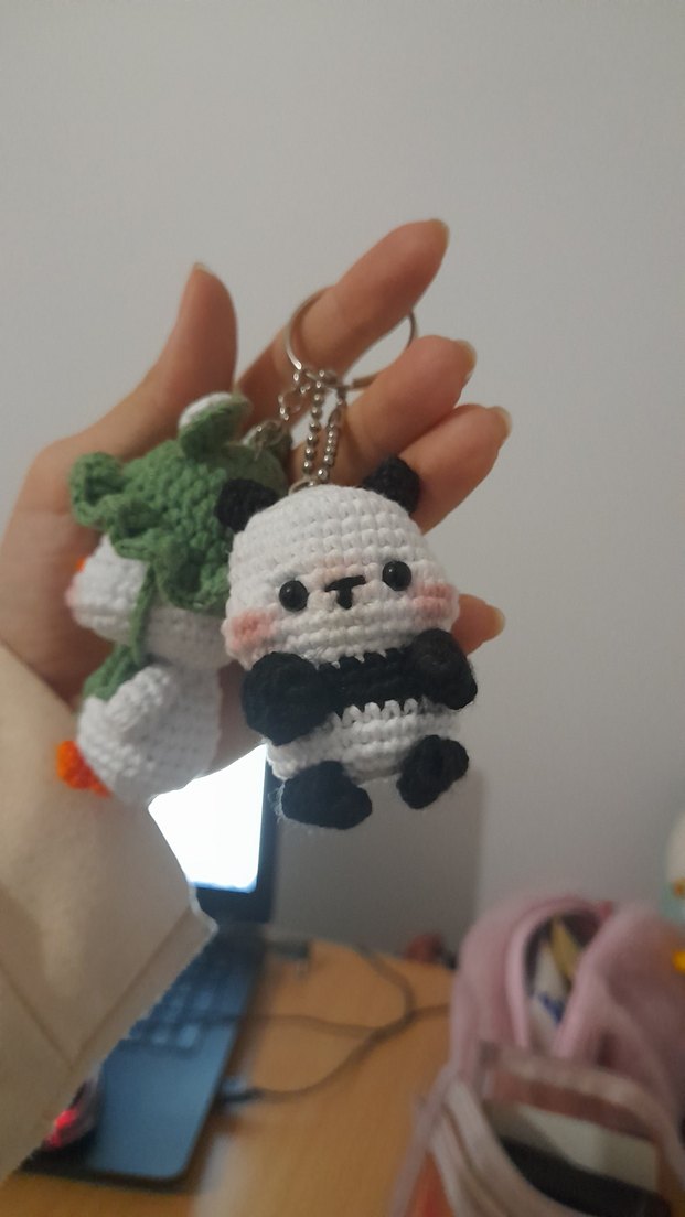 Renkli örgü iplikten yapılmış, siyah beyaz panda tasarımlı, sade ve hoş bir anahtarlık.