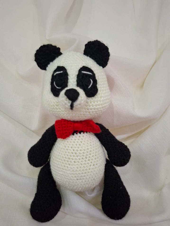 Bu renkli peluş oyuncak, kırmızı papyonlu beyaz siyah örgü pandadır. Yumuşak dokusu ve sevimli tasarımı vardır.