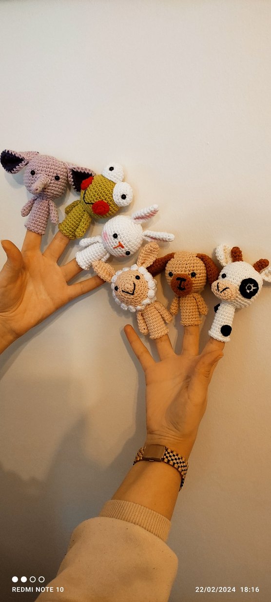 Çeşitli hayvan tasarımlarına sahip renkli el yapımı örgü parmak kuklaları. Yumuşak ve eğlenceli oyuncaklar.