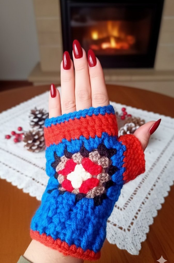 Örgü, renkli parmakları açık kadın eldiveni, rahat ve bohem tarzda, canlı desenlerle retro görünüme uygun.
