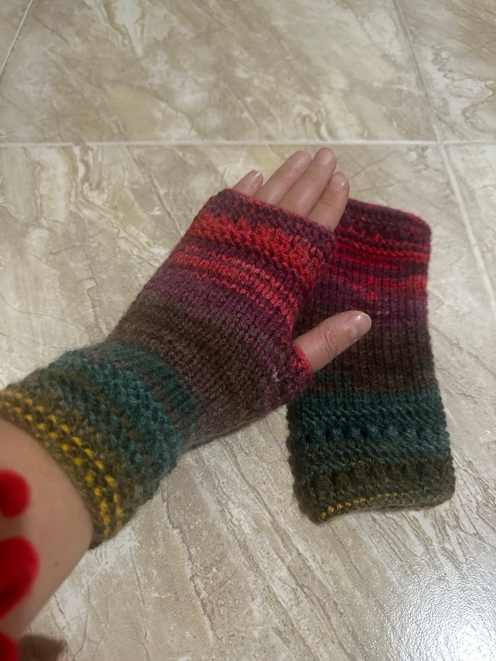 Koyu renklerde çok renkli örme parmakları açık kadın eldivenleri, rahat ve bohem bir tarz sunar. Retro ve hippie görünüm için uygundur.