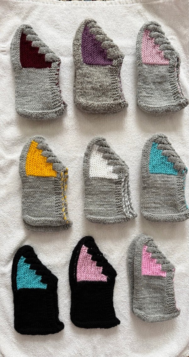 Çeşitli canlı renklerde, yumuşak örgüden yapılmış patikler. İsteğe göre renklerden yapılır