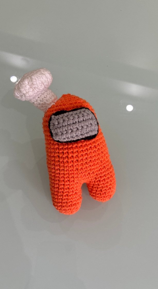 Gri ve turuncu renklerde, şef şapkalı detaylı örgü peluş oyuncak. Yumuşak ve el yapımı tasarım.