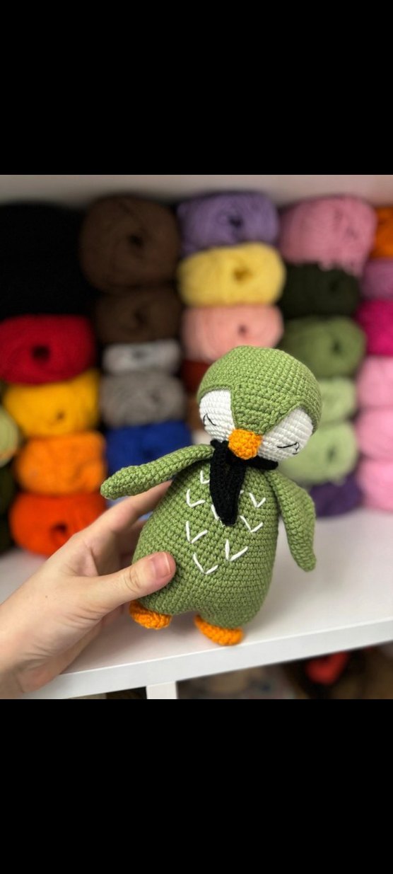 Turuncu ayak ve gagalı, işleme detaylı, renkli örgü peluş oyuncak kuş. Yumuşak ve el yapımı.