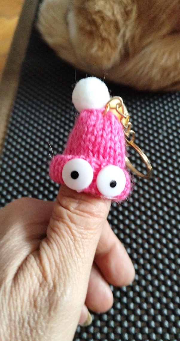Büyük gözler ve beyaz ponpon detaylı, rahat ve renkli pembe örgü anahtarlık, rock punk tarzıyla birleşiyor.