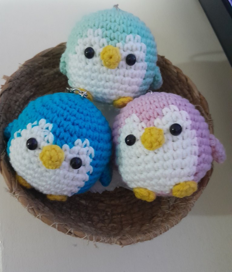 Mavi, pembe ve nane yeşili renklerde örgü peluş penguen oyuncaklar, yumuşak ve şirin koleksiyonluk ürünler .