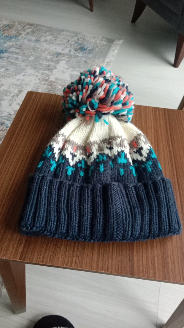 Renkli, büyük ponponlu kadın bere. Sıcak tutan örgü yapısıyla bohem ve retro tarzlara uyum sağlar.
