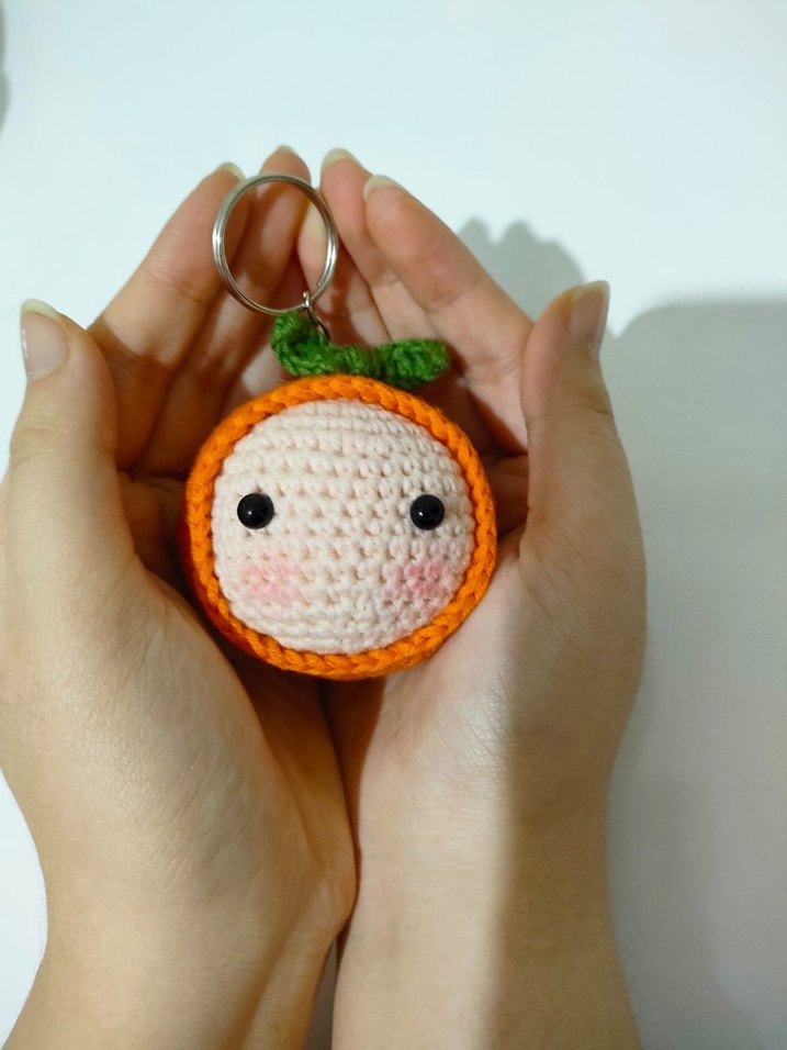 Renkli, örgü portakal şeklinde anahtarlık, sevimli yüz ve yeşil yaprak detaylı, bohem ve rahat tarzda.