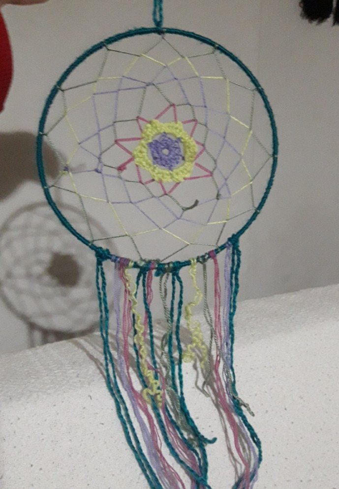 Çiçek desenli merkez ve sarkan iplerle renkli örgü sarkaç, herhangi bir odaya dekoratif dokunuş katar.