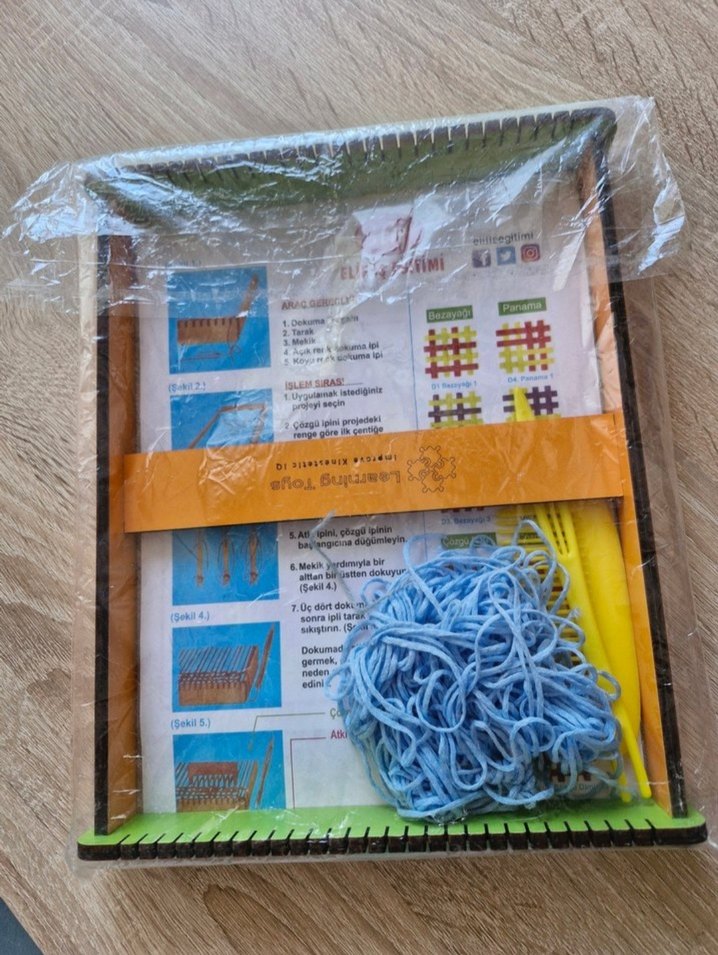 Ahşap çerçeveli, mavi iplik ve sarı örgü araçları içeren renkli örgü sepeti ve saklama çantası seti.