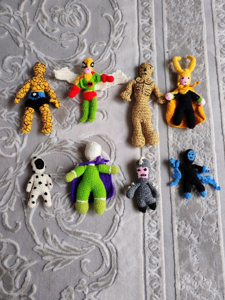 Farklı süper kahraman figürlerinden oluşan renkli el örgüsü oyuncak seti. Canlı renklerle detaylandırılmıştır.