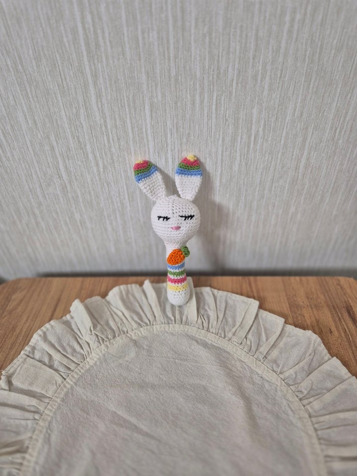 Renkli örgü tavşan diş kaşıyıcı oyuncak, yumuşak dokusu ve hafif renkleriyle bebeklerin diş çıkarma döneminde rahatlatıcıdır. Hem cingirak