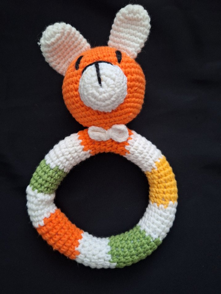 Bebeklerin kavrayıp diş etlerini rahatlatması için yumuşak dokulu renkli örgü tavşan şeklinde diş kaşıyıcı ve çıngırak.