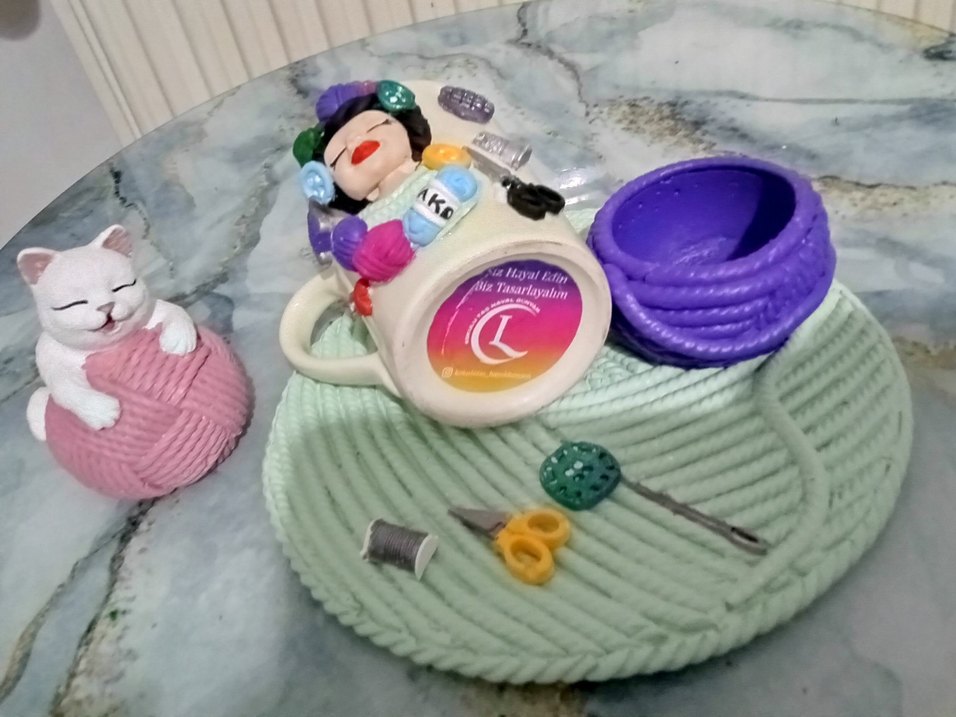 Pastel renklerde, dikiş temalı figür ve aksesuarlarla süslenmiş seramik kupa. Yanında uyumlu lokumluk.