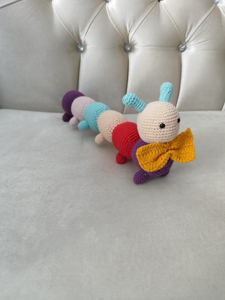 Çok renkli örgü tırtıl peluş oyuncak, büyük sarı fiyonk detayı ile yumuşak ve eğlenceli tasarım.