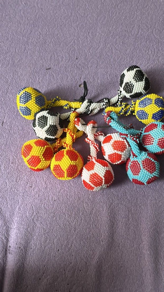 Yumuşak ipten yapılmış, farklı renklerde canlı desenlere sahip örgü top şeklinde anahtarlık seti. Kolay takılabilen halkası bulunur.