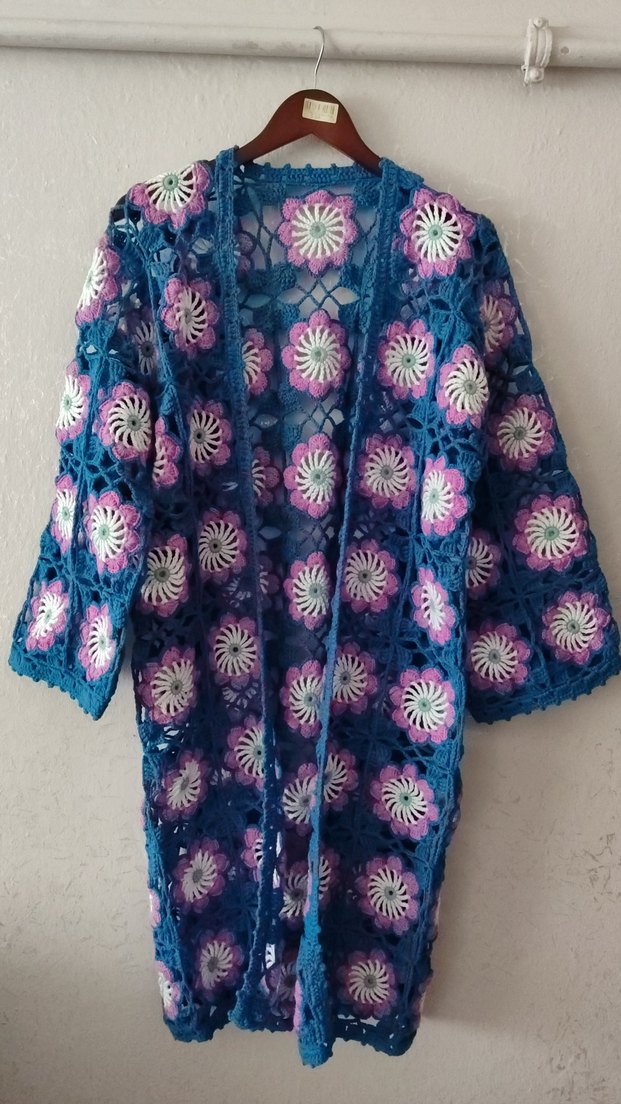 Renkli, örgü uzun hırka, bol kesim ve uzun kollu, yakasında kesik yaka detayları bulunur. Bohem tarzda, çok renkli çiçek desenlidir.
