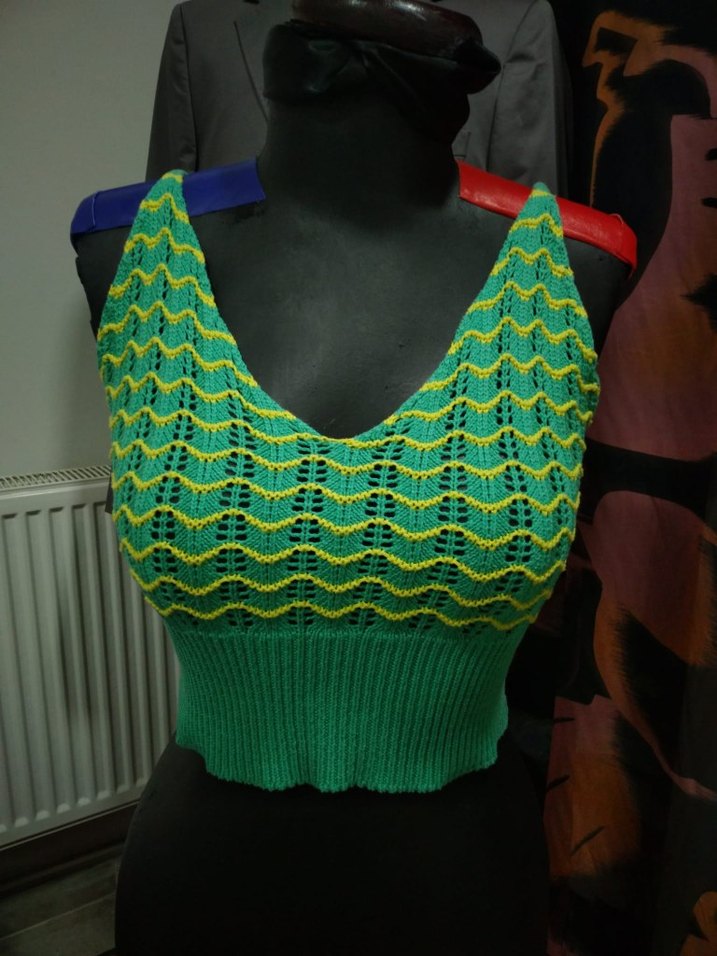 Renkli örgü kumaştan yapılmış, V yaka ve kolsuz mini uzunlukta, bohem tarzda dar kesim büstiyer.