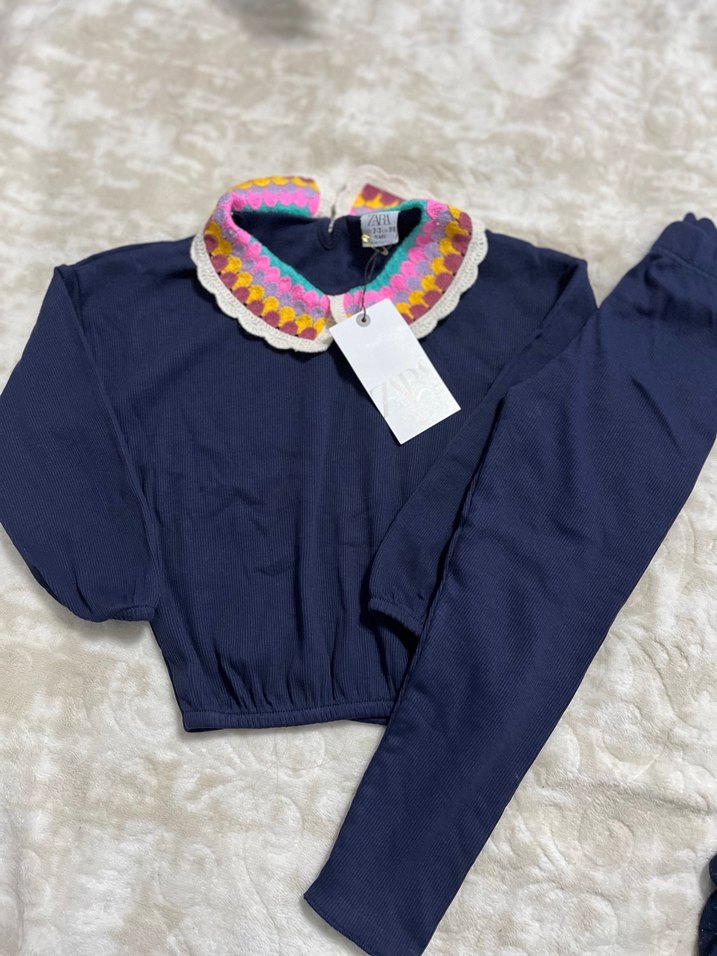 Uzun kollu, renkli örgü yaka detayı ve batik desenli bebek kız takımı. Uyumlu pantolon ile tamamlanmıştır.