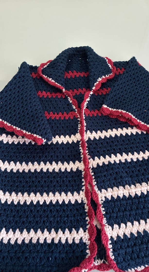 Renkli örgü yelek, uzun boy ve bol kesimlidir. Notlu yaka ve kısa kollu, günlük kullanım için rahat ve bohem tarz sunar.