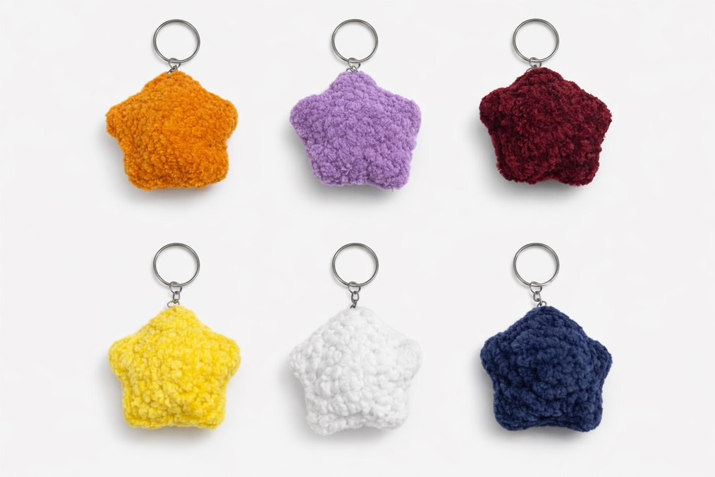 Yumuşak örgü kumaştan yapılmış, renkli yıldız şekilli anahtarlıklar. Rahat dokusu ve pop kültür tarzıyla anahtarlarınıza eğlenceli bir dokunuş katıyor.