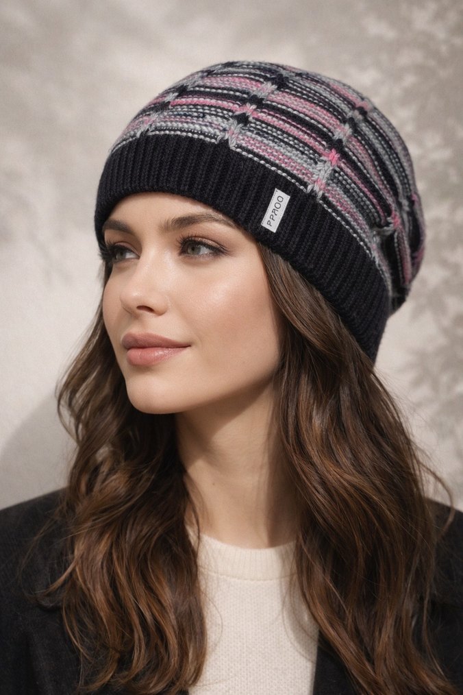 Kadınlar için siyah, gri ve mor desenli örgü yün bere, rahat ve şık bir görünüm sunar.