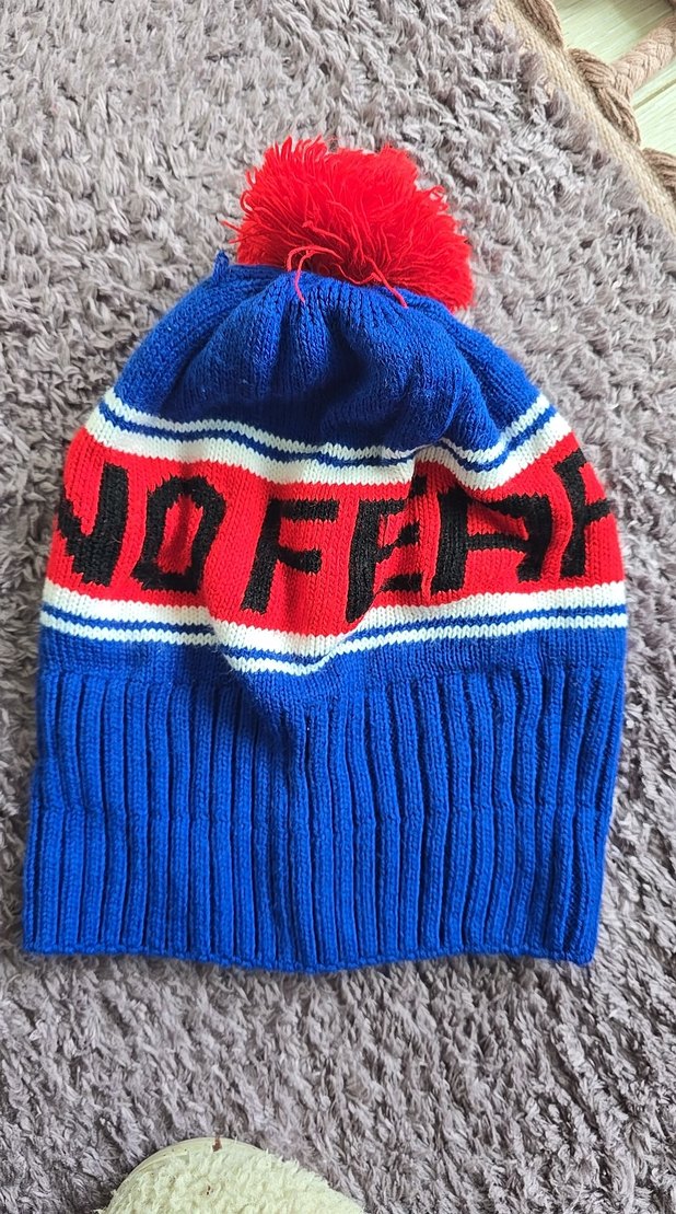 Renkli örgü yünden yapılmış, kırmızı ponponlu, rahat ve bohem tarzlara uygun kadın bere. üstünde "NO FEAR " yazili