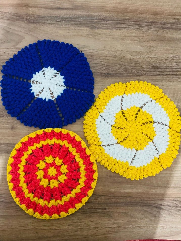 Mavi, sarı, sarı ve kırmızı renklerde yumuşak iplikle örülmüş renkli yuvarlak dekoratif banyo lifleri.