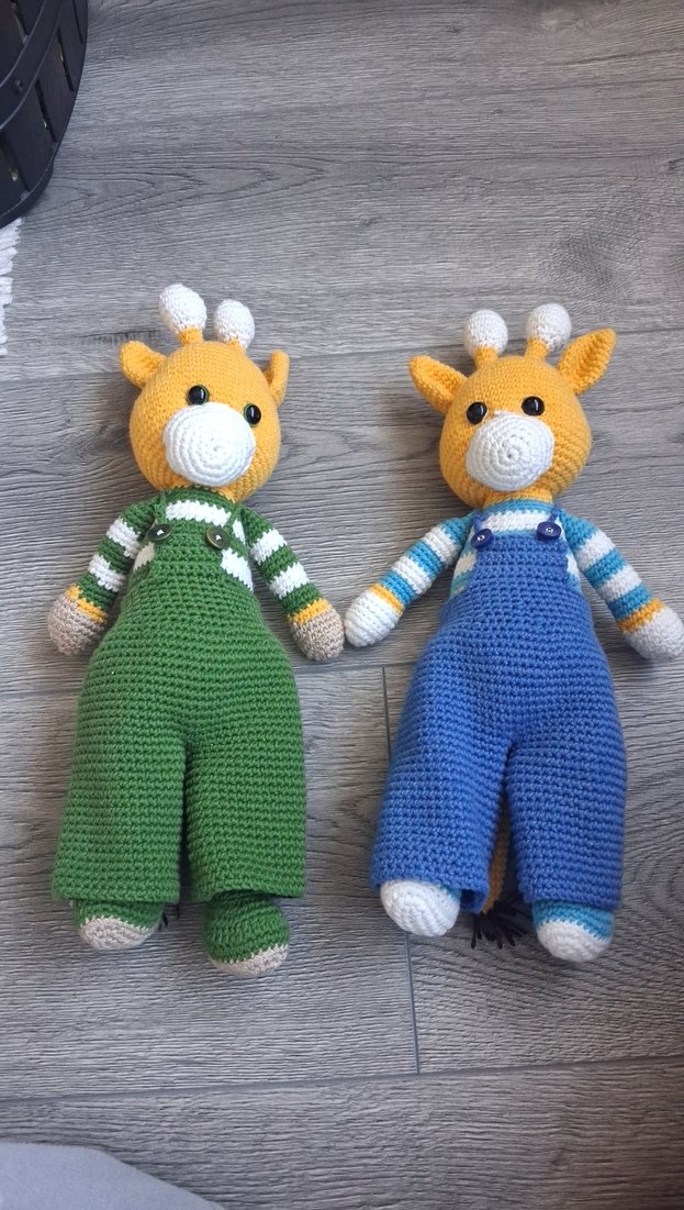 Çizgili gömlek ve yeşil ile mavi tulum giymiş iki renkli örgü zürafa peluş oyuncak. Yumuşak ve el yapımı, detaylı özelliklere sahip.