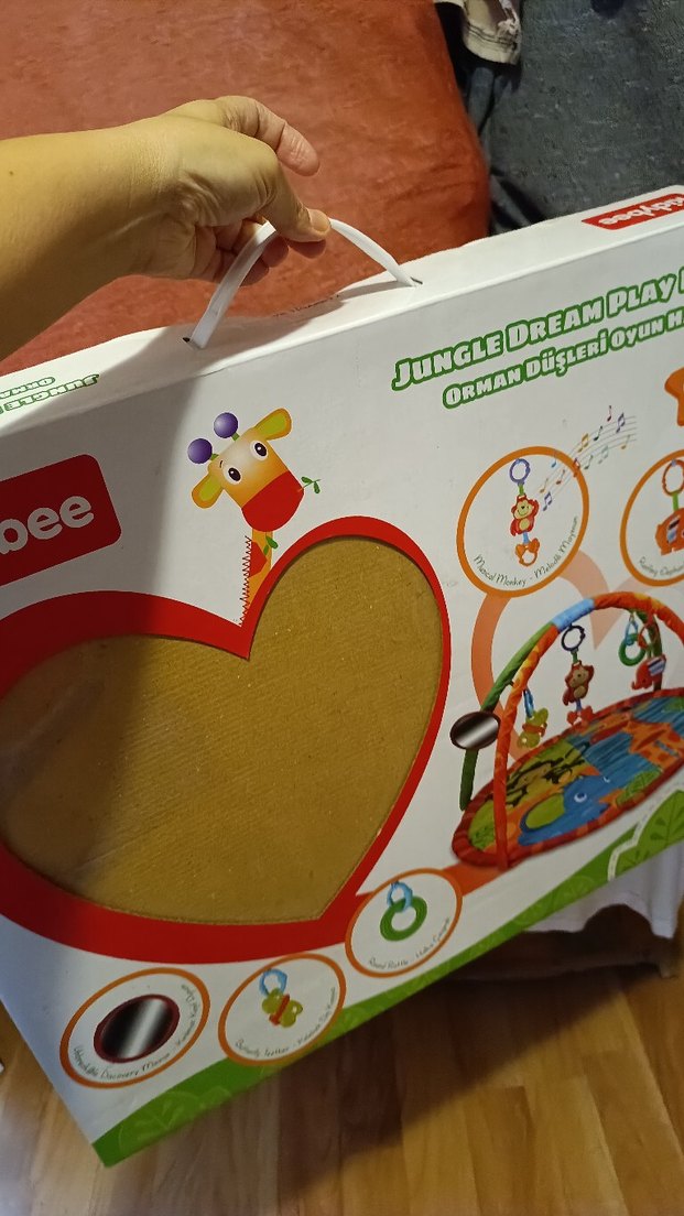Renkli orman temalı bebek oyun halısı, çeşitli asılı oyuncaklar ve yumuşak yüzey içerir. Bebeklerin oyun sırasında etkileşimde bulunmasını sağlar.