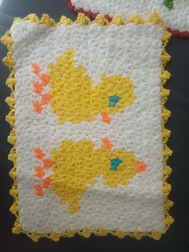 Sarı ördek desenli, turuncu ve yeşil detaylı renkli örme banyo lifi. Yumuşak dokusu ile nazik temizlik sağlar. depremden sonra ayakta durabilmek için el emeğimi satıyorum