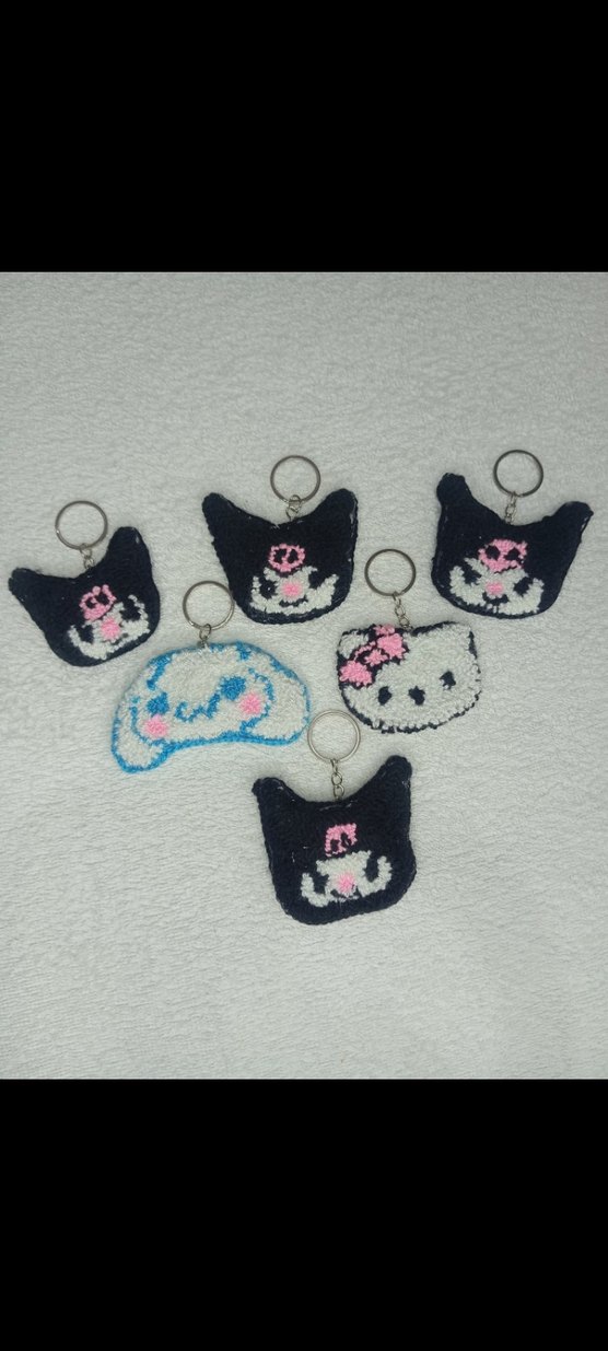 Renkli, örme kadın anahtarlıklar; sevimli kedi ve bulut figürleriyle sıcak, punk-ruhlu bir hava katıyor.