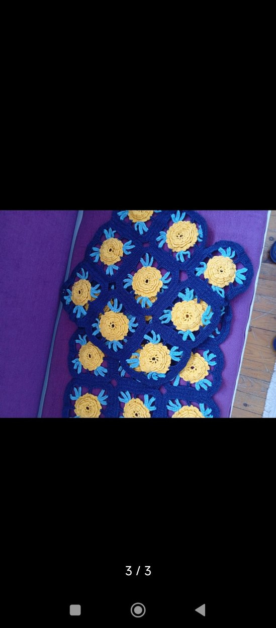 2 adet renkli örme kırlent , sarı ve mavi çiçek desenleriyle canlı bir görünüme sahip.