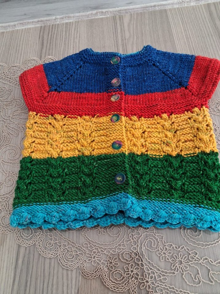 renkli ,Bohem tarzda kolsuz kız çocuk yelek örme ve düğmeli kapamalıdır .yumuşak dokulu, vücuda oturan tasarıma sahiptir.