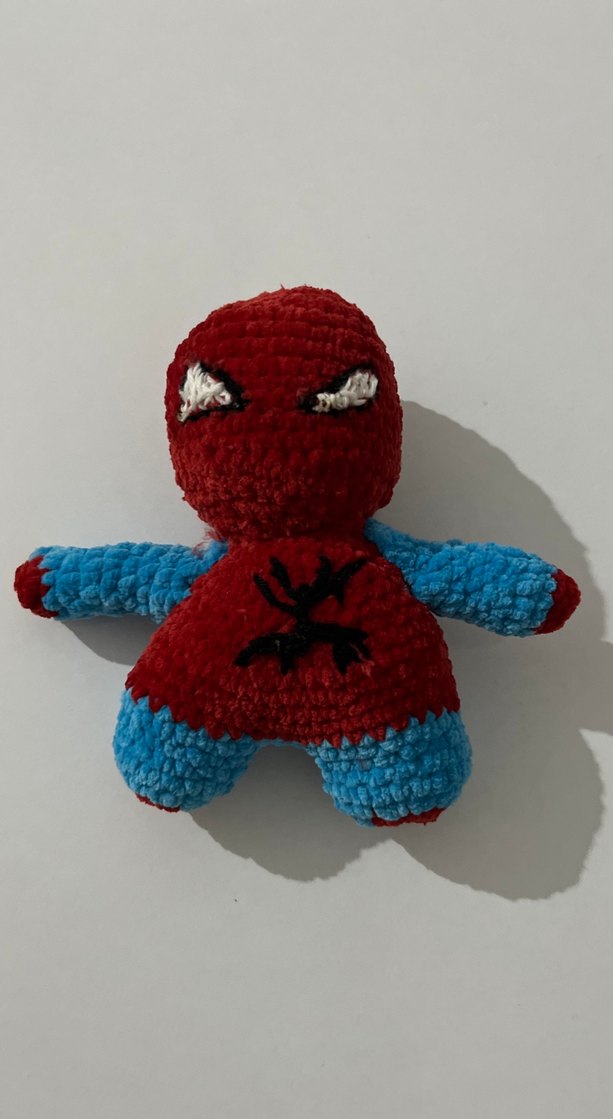 Detaylı gözleri ve göğsünde örümcek sembolü olan renkli örme Örümcek Adam figürü. Yumuşak dokulu, canlı kırmızı ve mavi renklere sahip. ️