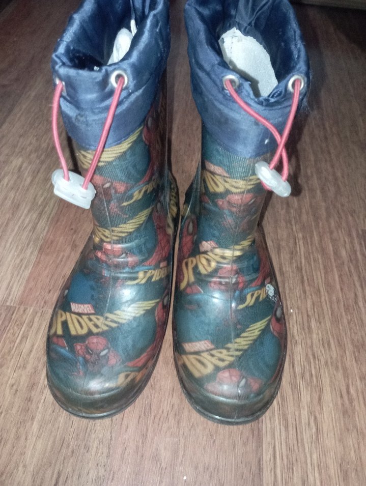 Renkli Örümcek Adam desenli mavi kauçuk erkek çizme. Bağcıklı ve ayarlanabilir üst kısmı ile dikkat çeker. marka temsili