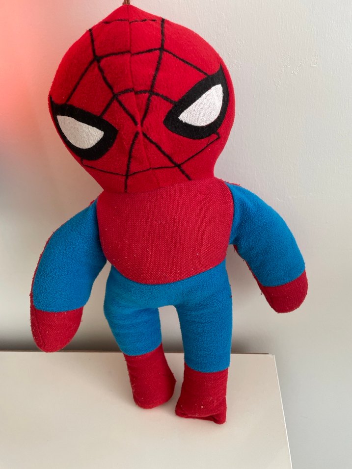Kırmızı ve mavi yumuşak kumaştan yapılmış, detaylı ağ ve göz desenlerine sahip renkli Örümcek Adam peluş figür. Canlı bir koleksiyon oyuncağı. ️
