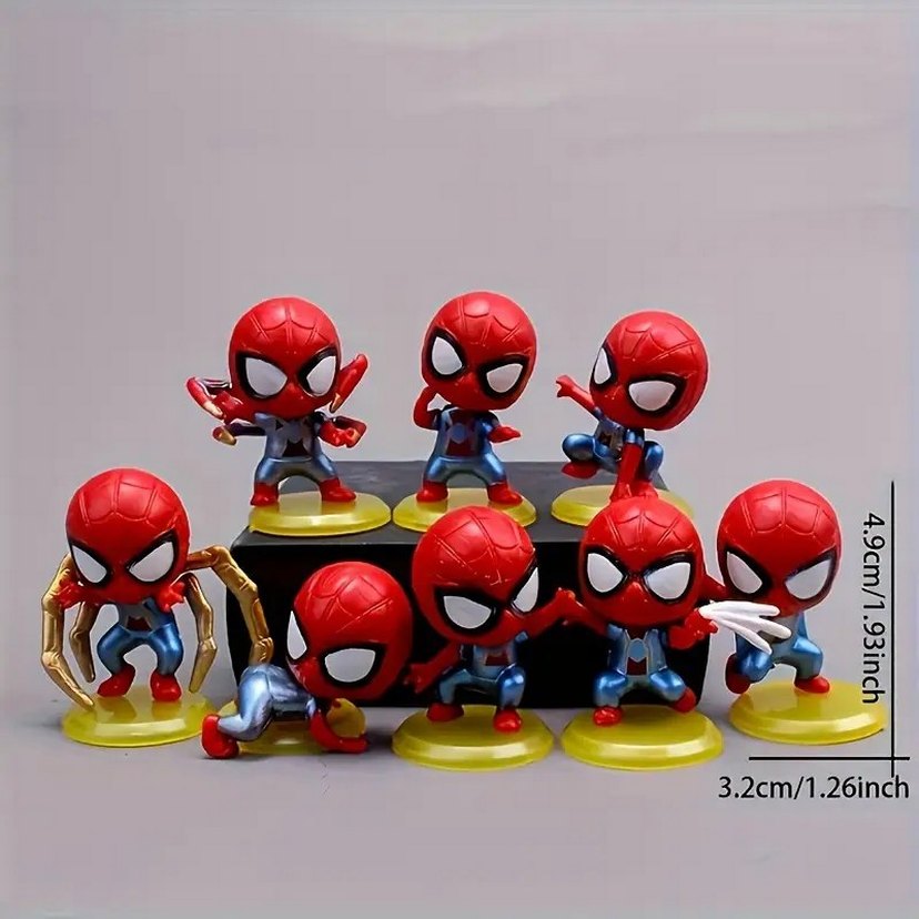 Renkli Örümcek Adam figürleri, 3,2 cm boyunda, farklı pozlarda ve canlı kırmızı-mavi renkte tasarlanmıştır. ️