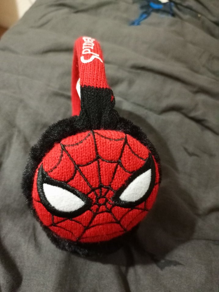 Yumuşak kulak pedlerine sahip, renkli Örümcek Adam temalı kırmızı oyun kulaklığı.