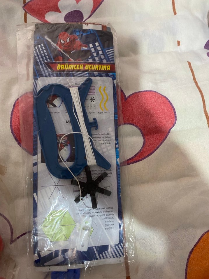 Renkli mavi örümcek desenli uçurtma, plastik malzemeden. Kolay kullanım için cırt cırtlı bant ve ip ile birlikte gelir.
