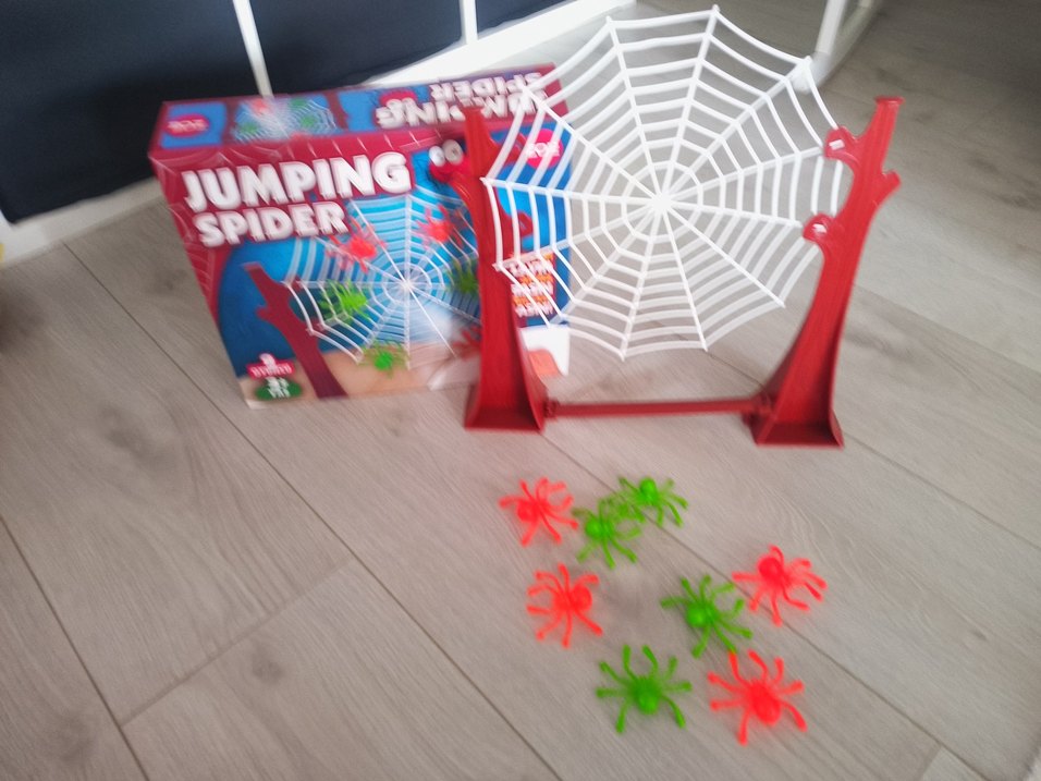 Renkli küçük örümcekler ve beyaz örümcek ağı bulunan kırmızı stand ile etkileşimli oyuncak seti. ️
