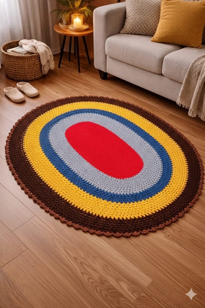 Renkli oval paspas kırmızı, mavi, sarı, gri ve kahverengi halkalarla sıcak ve eğlenceli bir görünüm sunar. Boyutları boyu: 108 cm eni: 86 cmdir.