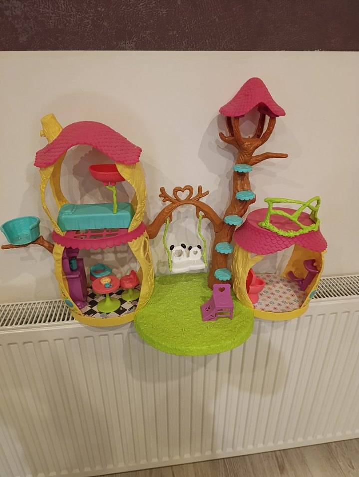 Oyun evi, salıncak ve mobilyalar içeren renkli oyuncak seti. Ağaç detayları ve canlı renklerle hayal gücünü destekler.