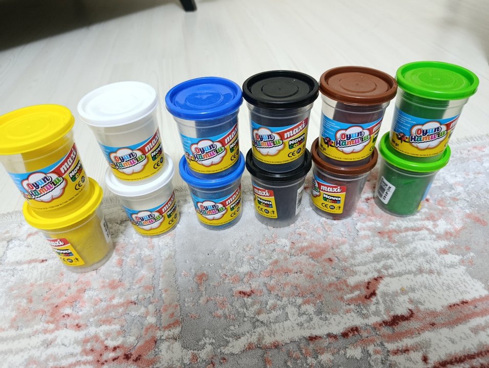 Çeşitli renklerde oyun hamuru kutuları içeren set, yaratıcı oyun ve öğrenme için uygundur. 2 renk 30 tl dir
