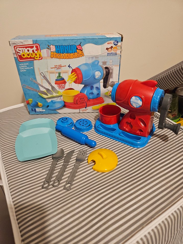 Yaratıcı oyun için çeşitli aksesuarlarla renkli hamur makinesi seti. Hamur sıkacağı, şekillendirme araçları ve mutfak gereçleri içerir.