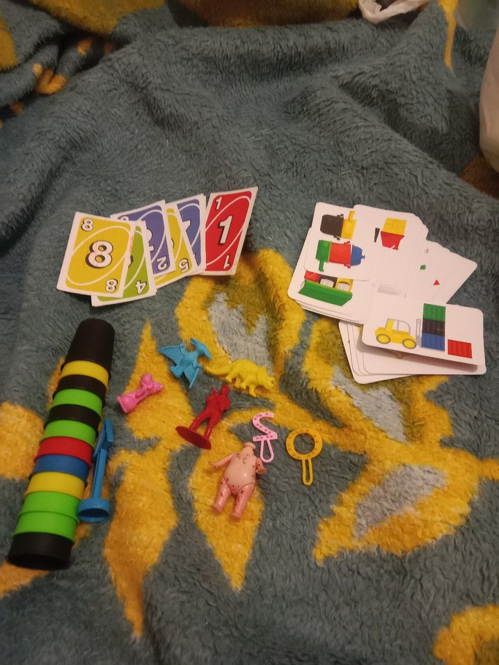Renkli oyun kartları, küçük figürler ve üst üste dizilen halkalar çeşitli oyun seçenekleri sunar. Sayı ve resimli kartlar içerir. hepsinin fiyatıdır isteyen bu ilanı satın alabilir 80 TL kalacak şekilde satışta